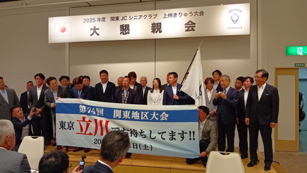 活動報告 関東JCシニアクラブ上州きりゅう大会に参加しました obuser 2025年8月5日 梅雨が明けたかと思う程の酷暑の中、関東JCシニアクラブ上州きりゅう大会に幹事長と副幹事長の3名で参加して来ました。大懇親会では、井奥先輩が乾杯の挨拶と発声をされていました。来年は東京ブロックの立川での開催になります。 Continue Reading Previous: 2025年度納涼例会開催についてNext: 納涼ボウリング大会(納涼例会)開催報告ならびにタートン来松報告 Related Stories 活動報告 2025年度日本JC千葉ブロック協議会OB会総会に参加 obuser 2025年9月11日 活動報告 現役の総会に参加しました obuser 2025年8月21日 活動報告 開催報告 納涼ボウリング大会(納涼例会)開催報告ならびにタートン来松報告 obuser 2025年8月5日